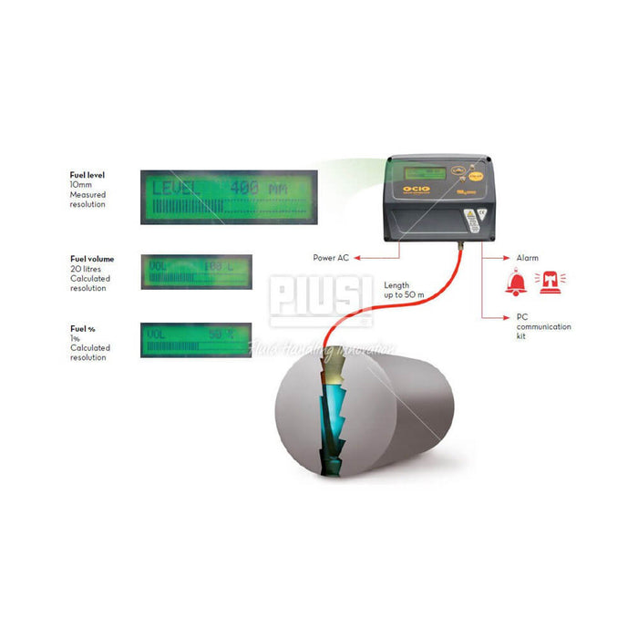 PIUSI OCIO is an innovative system for monitoring the fluid level inside atmospheric tanks. The system detects the static pressure generated by the fluid height by means of a tube inserted in the tank and displays the fluid level or volume.